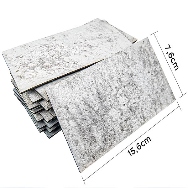 A forma retangular (15,6 x 7,6 cm) permite vários padrões. Cada conjunto de 10 azulejos cobre cerca de 0,12 metros quadrados, perfeito para designs criativos.
