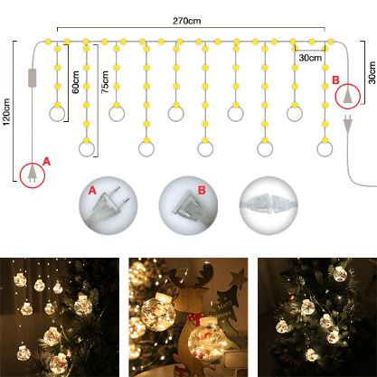 O conjunto de luzes contém 10 bolas com luzes, figuras, neve artificial e cones.