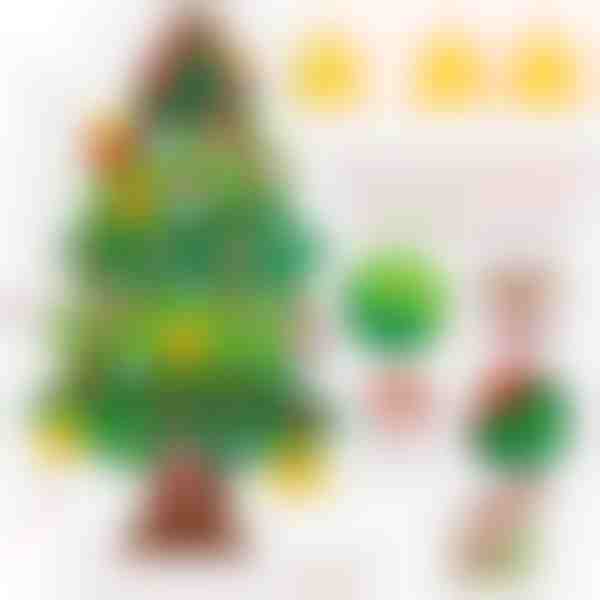 Feitos do mesmo feltro pesado de alta qualidade. Prendem-se com tiras de velcro costuradas (ao contrário das coladas mais baratas). Exemplos incluem sinos, presentes, boneco de neve, doces e flocos de neve. A árvore tem uma estrela para o topo e um tronco para a base. O velcro é costurado na árvore para fixar ambas as peças de forma segura.