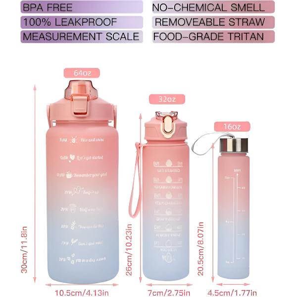 Este conjunto inclui três garrafas de água de cor gradiente, cada uma com uma frase motivacional na frente e medidas de volume no verso.