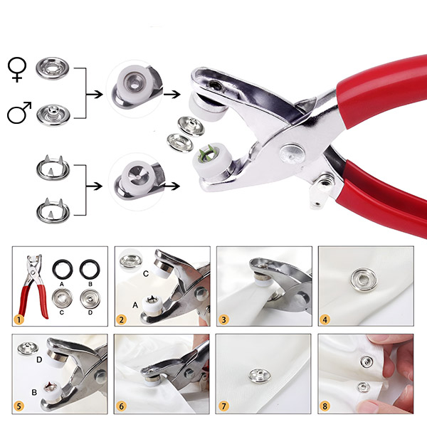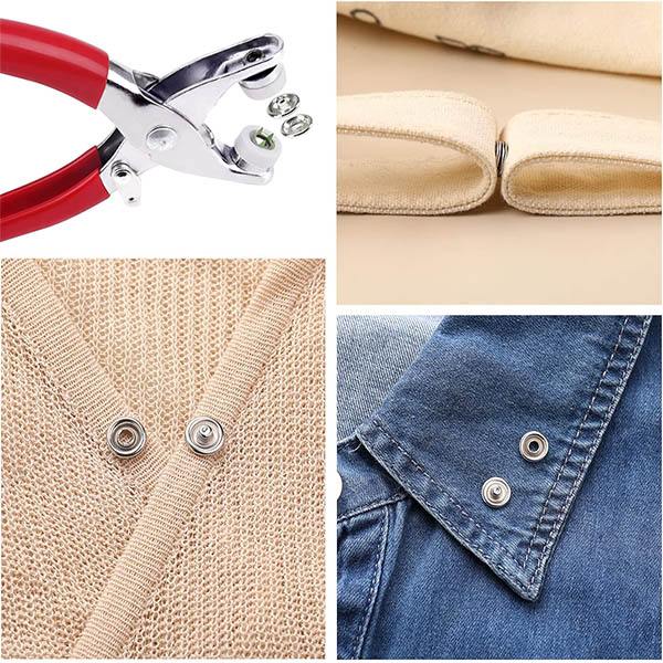 Os alicates permanecem fortes mesmo com uso intenso. Emparelhado com fechos resistentes à ferrugem, este kit funciona perfeitamente em tecidos como algodão, ganga, lona, poliéster e até couro.
