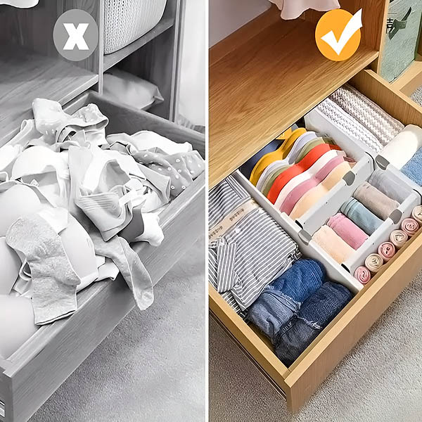 Não apenas para gavetas – esses divisores também funcionam perfeitamente em prateleiras. Use-os para organizar livros, cosméticos ou materiais de escritório em prateleiras abertas, mantendo tudo no seu devido lugar.